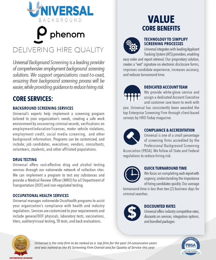Universal Background Screening offers businesses certainty in the employment process through a comprehensive selection of employment background checks, drug testing, physical exams, and compliance management solutions. Our management team shares over forty years of industry expertise. A licensed private investigator oversees our procedures to insure compliance with legal regulations and background screening best practices.